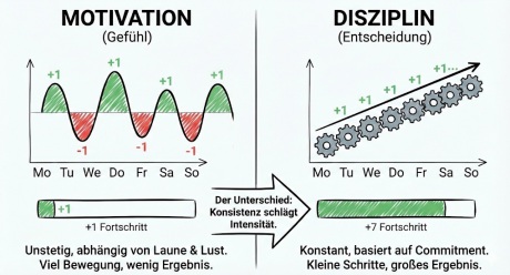 Für dich ist das eine gute Nachricht. Wenn du anfängst, Disziplin zu leben, hast du kaum noch Konkurrenz. Während die anderen auf der Achterbahn ihrer Gefühle fahren, ziehst du auf der Überholspur vorbei – ganz unspektakulär, Schritt für Schritt, jeden verdammten Tag.